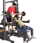 Construction: Four 3” x 3”, 7-gauge welded uprights, linked together by a double sided “side-entry” weight storage system (wrinkle-black powder-coated), offering both sides the ability to store equal amounts of plates.