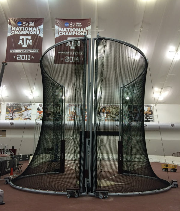 UCS® Futura 7200 Indoor Throwing Cage - Innovative design that integrates the door functionality to the cage itself in a 2-part design. This allows for a better view of the athlete as there are only 3 posts. Engineered with six 8" non-marking swivel casters, the cage can easily be rolled away on flat surfaces.